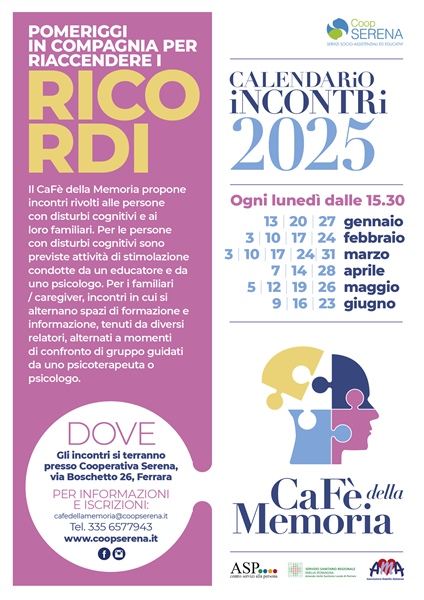 5/9/2025 Riprendono, da lunedì 8 settembre, i Cafè della Memoria Incontri gratuiti rivolti alle persone con disturbi cognitivi e ai loro familiari, realizzati in...